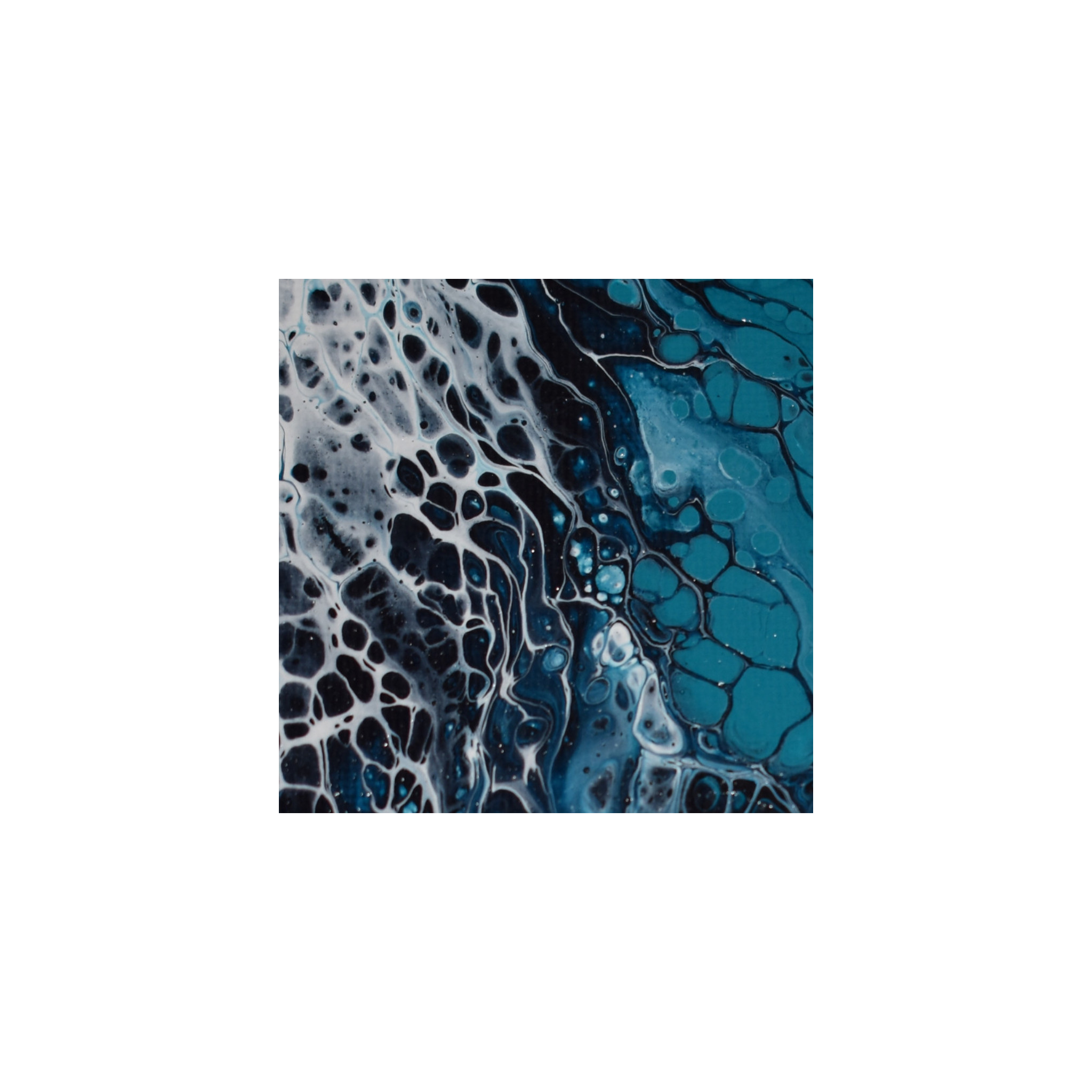 Technique: Dutch Pour. The paint was poured onto a base layer of white paint, and then the design was created using a hairdryer.