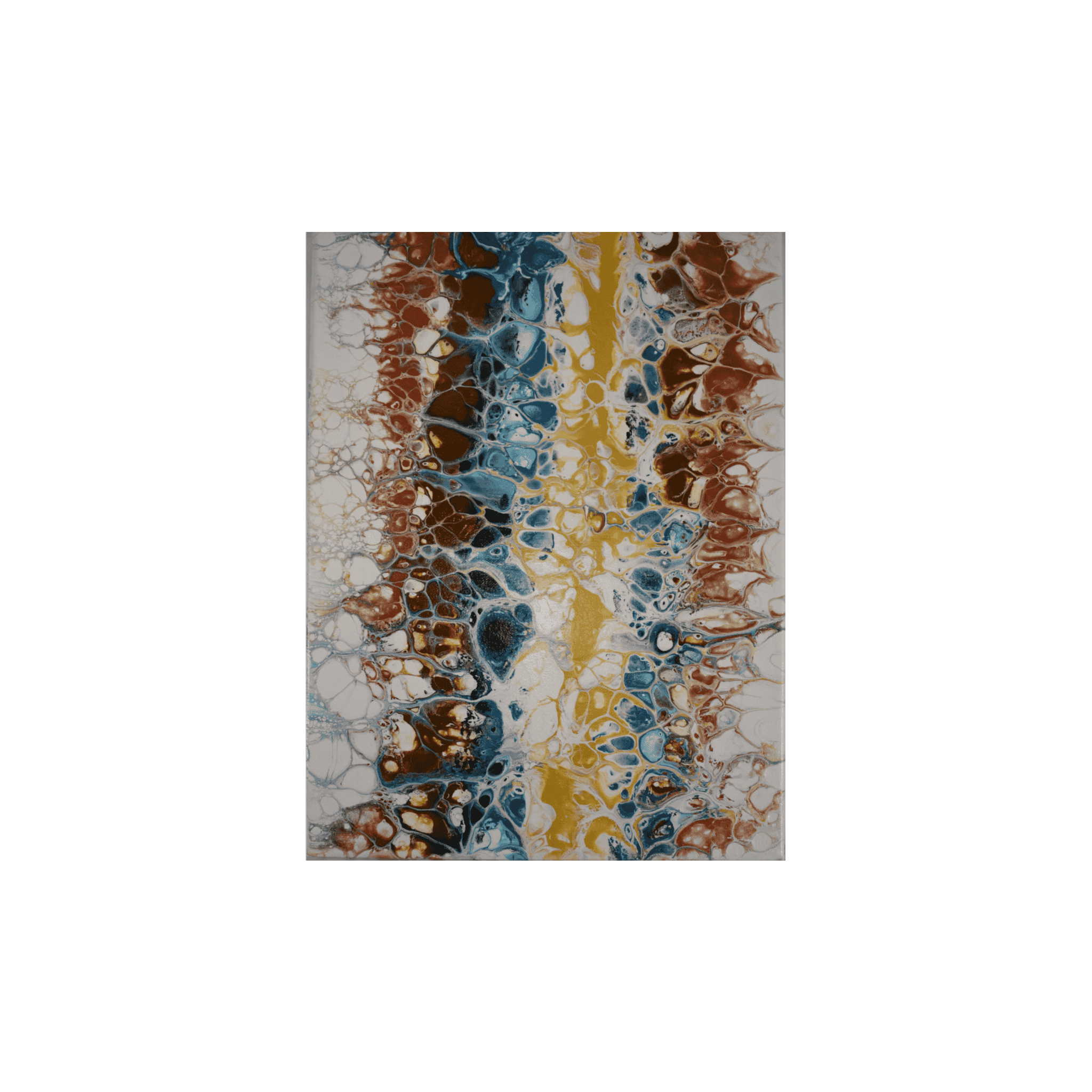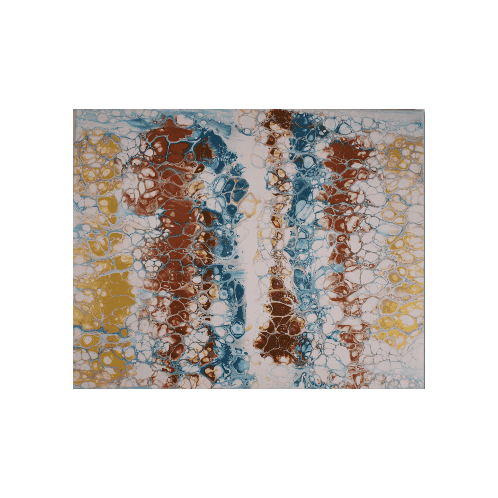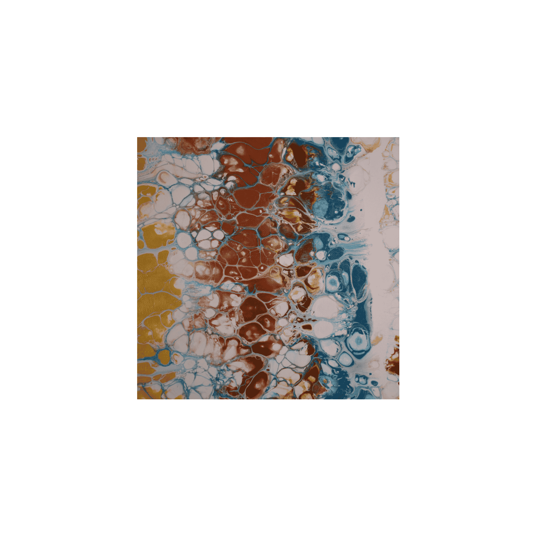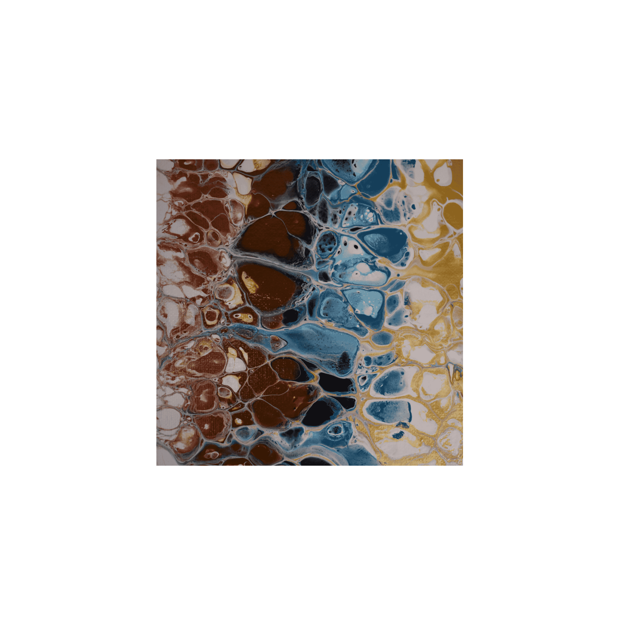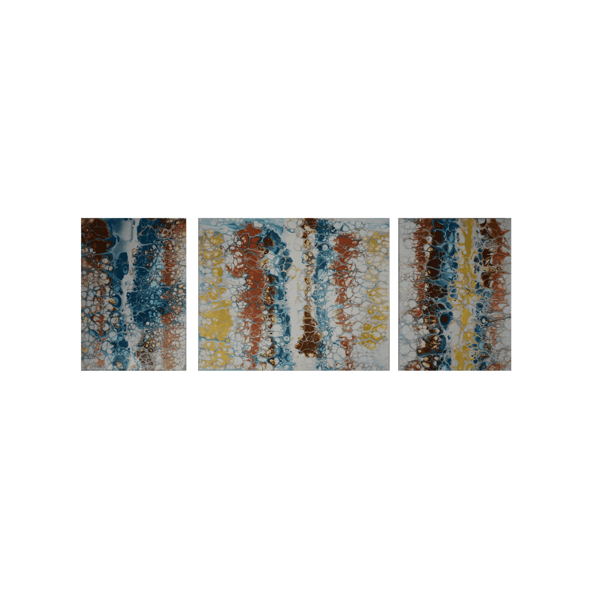 Technique: Swipe. The paint was poured onto a base layer of white paint, and then the design was created using by swiping the paint across the canvases to reveal cells and lacing effects.