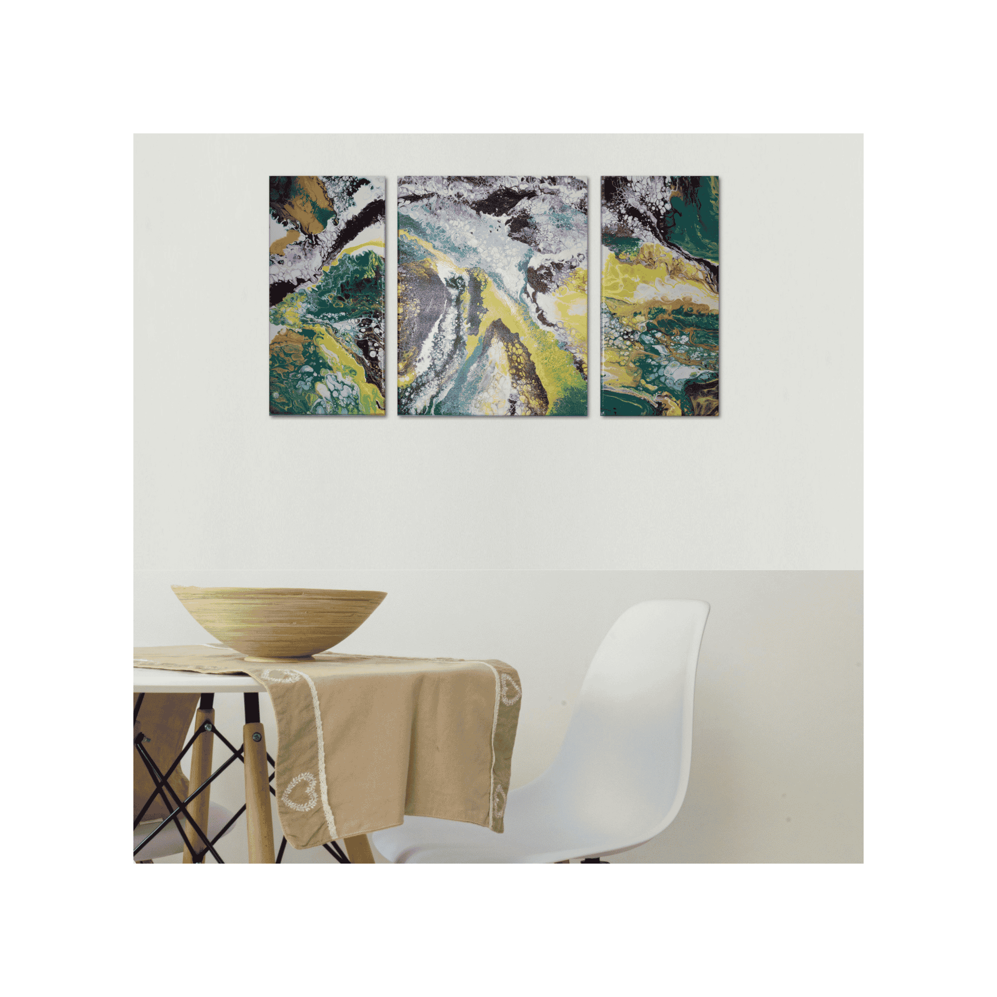 Technique: Dutch Pour. The paint was poured onto a base layer of white paint in a linear design, and then the design was further created using a hairdryer and tilting the canvases.