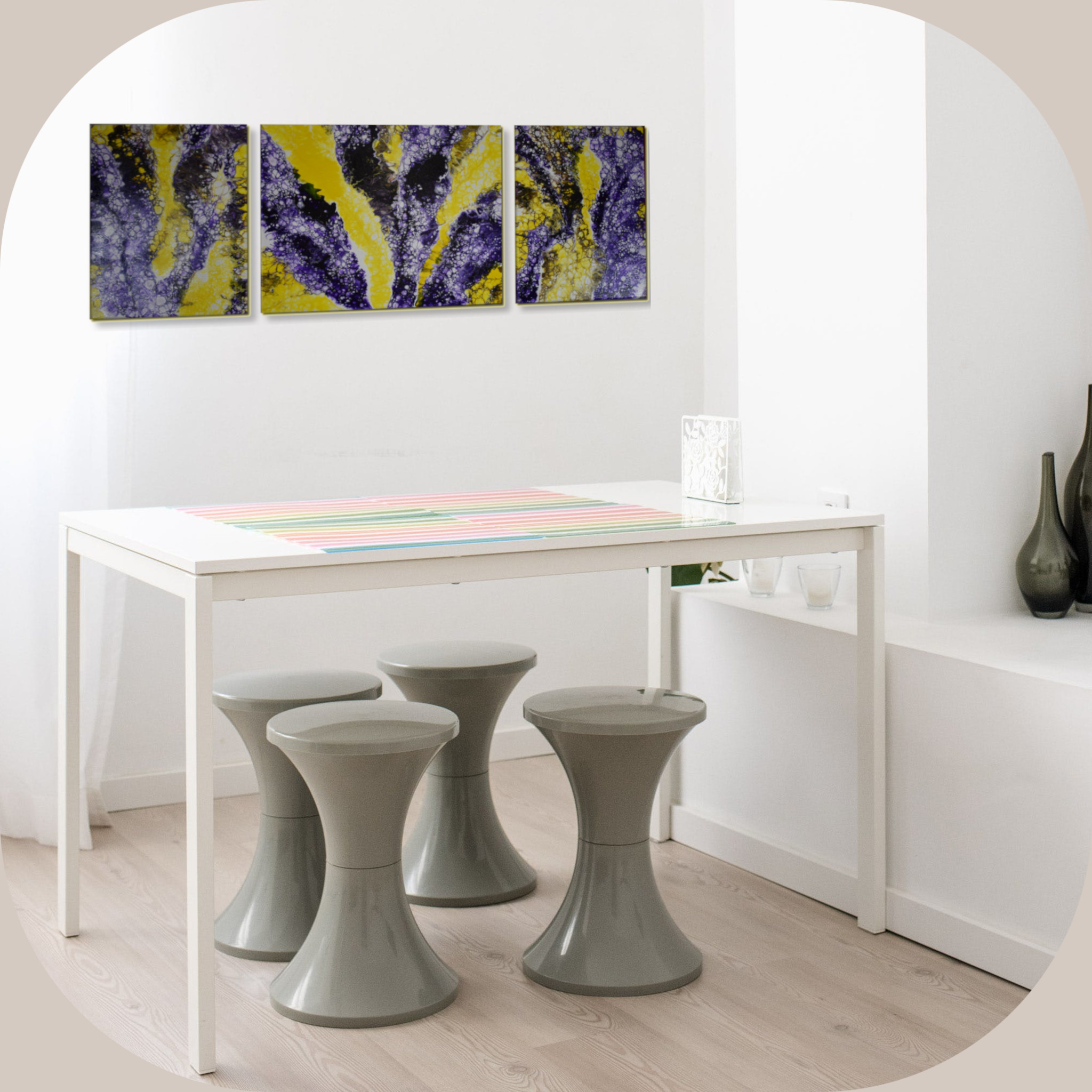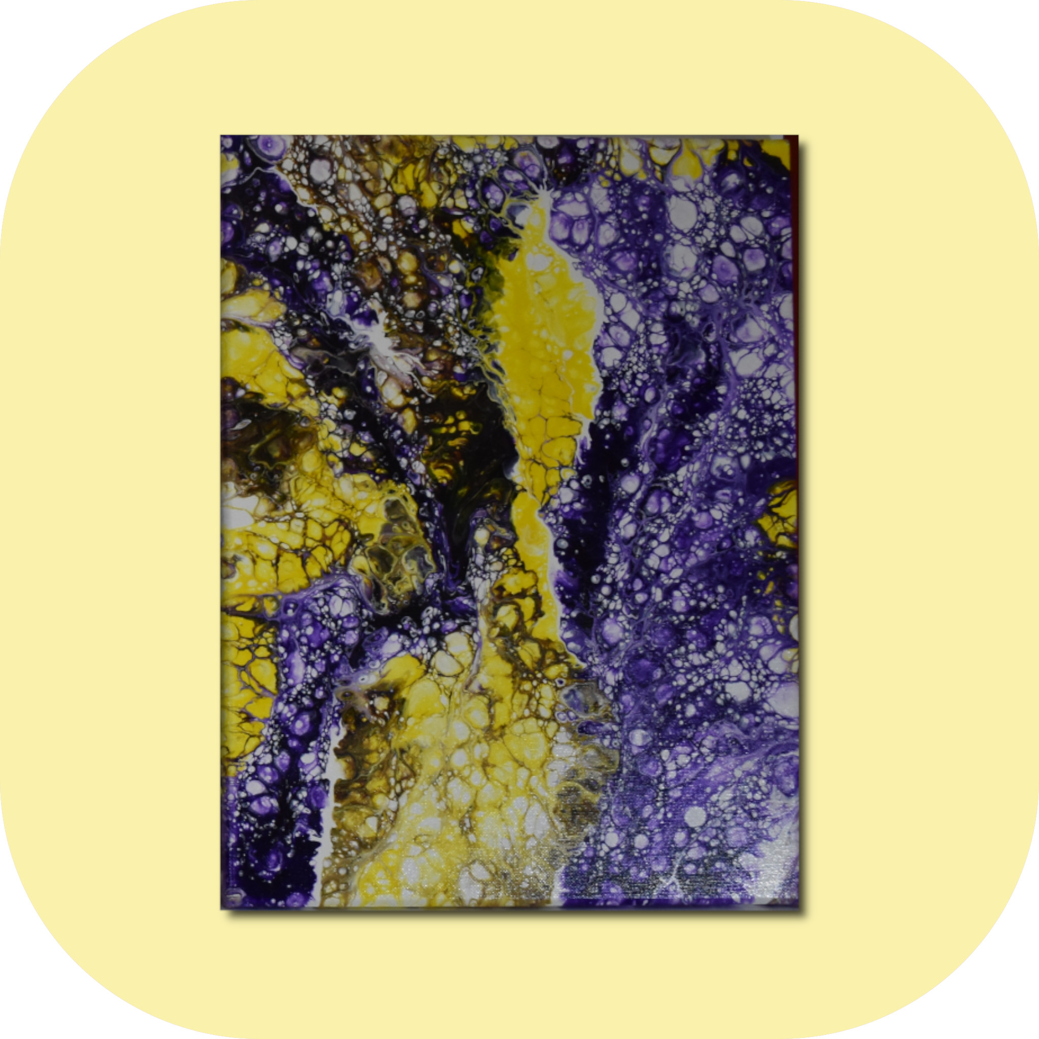 Description: Royal Citrus is a one-of-a-kind acrylic paint pour that was inspired by spring narcissus and crocus flowers.