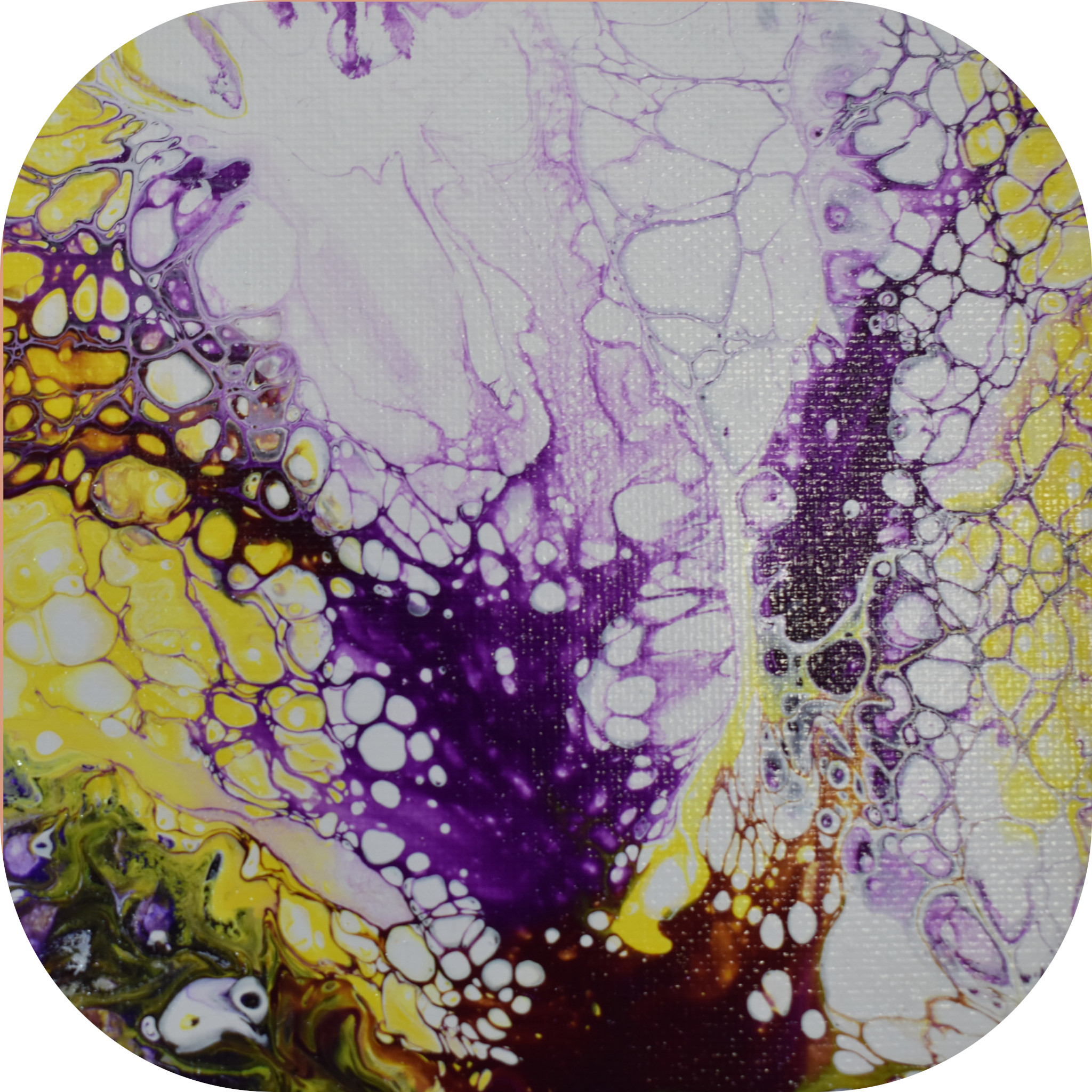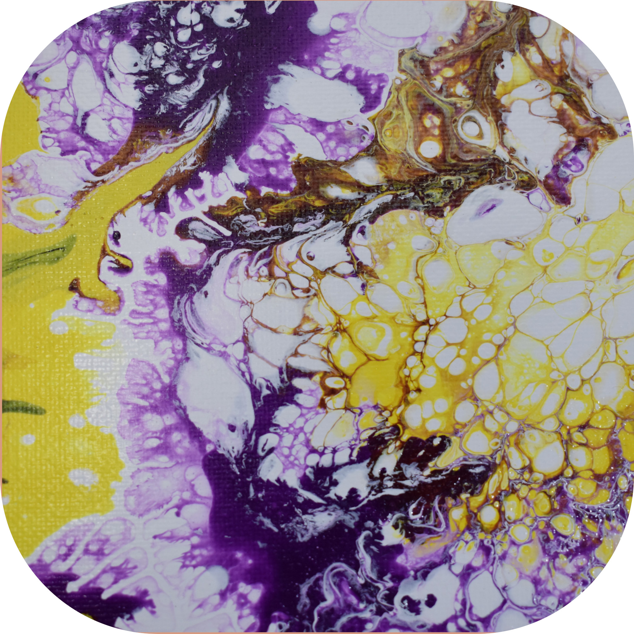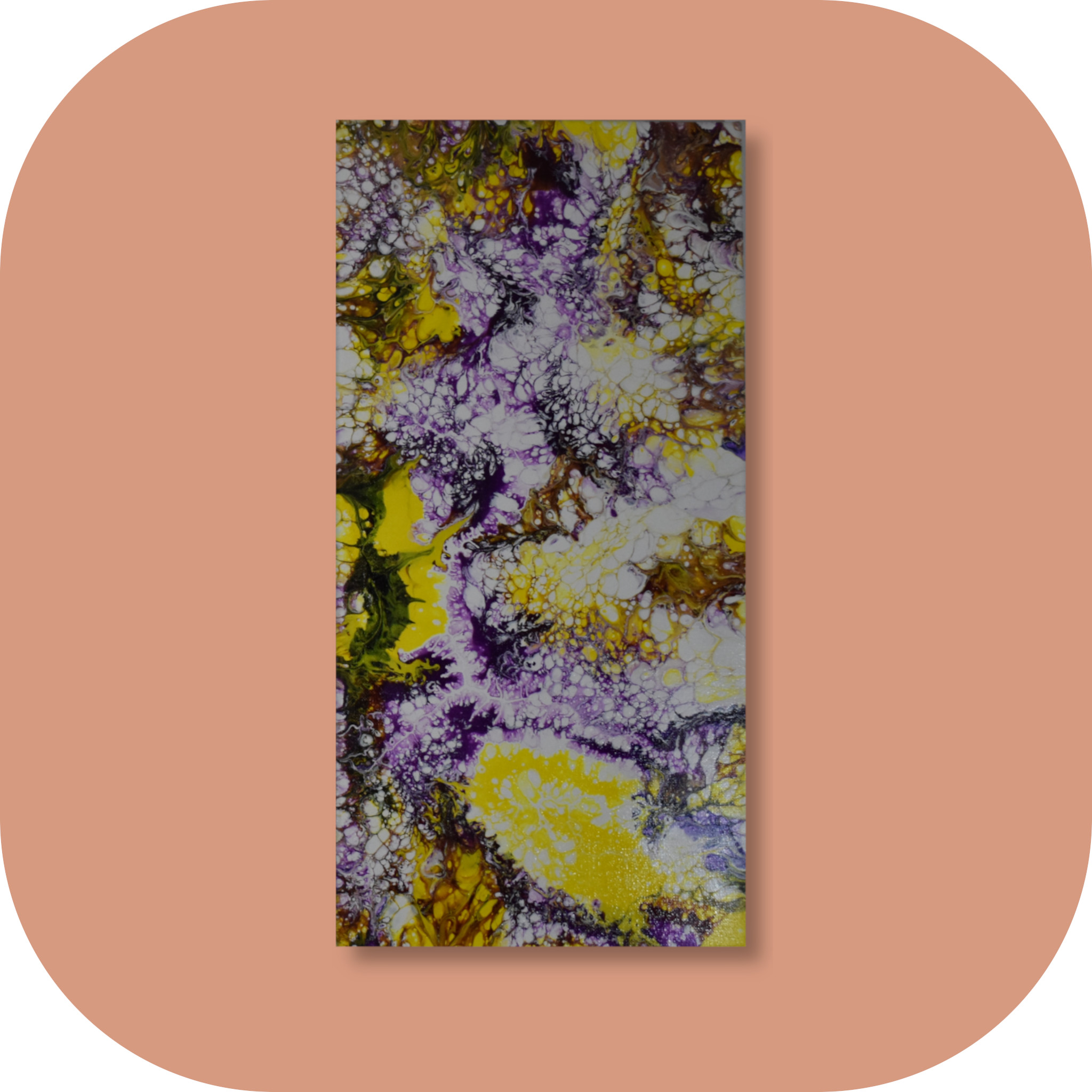 Description: Windblown Mulberry Lemonade is a one-of-a-kind acrylic paint pour that was inspired by spring narcissus and crocus flowers.